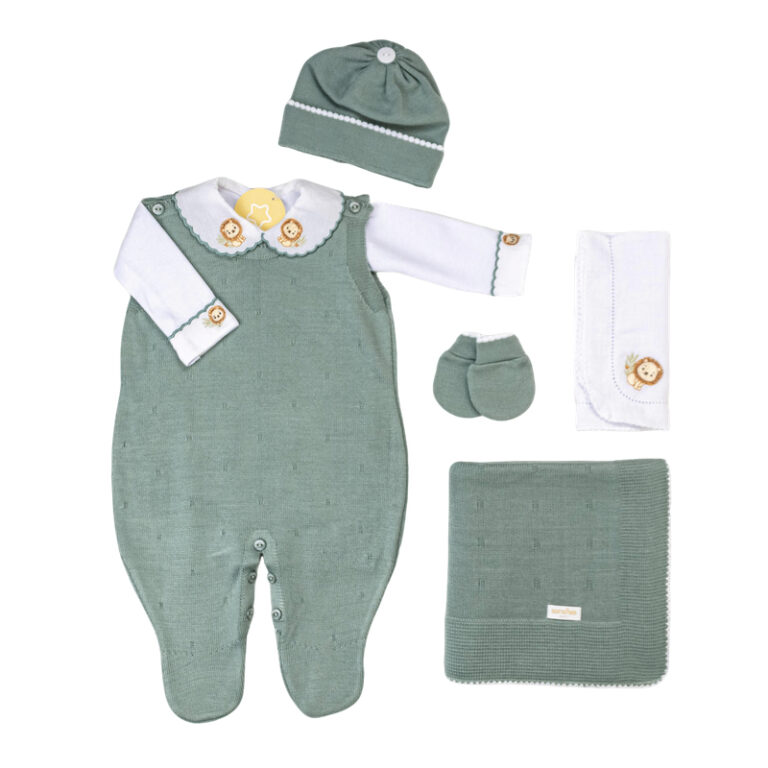 Saída de Maternidade Macacão Safari Leão e outros – 6 Peças Bordadas | Tamanho RN